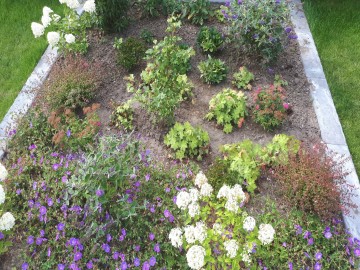 Bij het ontwerp voor deze landelijke tuin is rekening gehouden met de ligging van de woning. De wens van de bewoners was om het ruimtelijke effect te behouden maar het zicht op de terassen te verminderen. Dit is gerealiseerd door aan de zijkant van de woning verspringende borders te maken die omzoomd zijn met bielzen. De beplanting in de borders ontnemen het zicht op de terassen.Bloesems in het voorjaar was ook zeer gewenst, hiervoor zijn leibomen van Pyrus calleryana 'Chanticleer' aangeplant. De Douglas palen zijn onderling verbonden met steigerbuizen wat een stoere en landelijke uitstraling geeft.