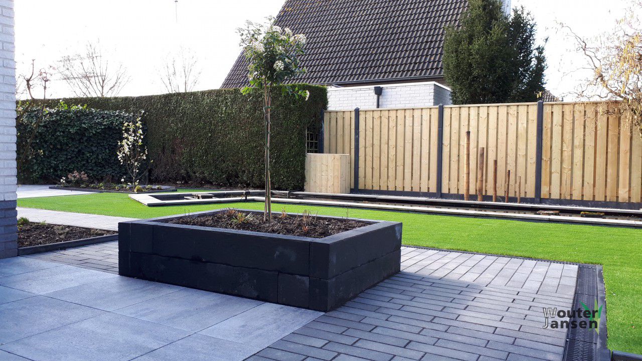 Deze tuin is geheel gerenoveerd. Bomen, grind en bestrating zijn verwijderd. De vijver is gebleven en enkele leibomen. De klant heeft zelf het ontwerp gemaakt en aan de hand van deze tekening is de tuin opgebouwd. Een nieuw terras, paden en borders. Douglas palen, verbonden met steigerbuizen geven hoogte in de tuin. Door ons is er een beplantingsplan gemaakt. Enkele planten en heesters uit de "oude" tuin zijn weer aangeplant. Aangevuld met nieuwe bomen, heesters en vaste planten. Een tuin waar men jarenlang mee vooruit kan.
